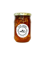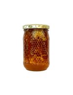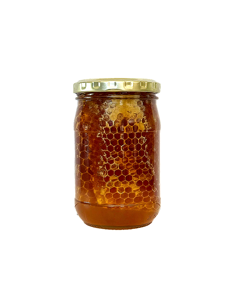Imagine a jar filled with our smooth, golden Fynbos honey, and nestled within it, a generous chunk of raw honeycomb.