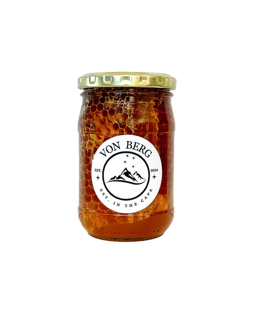 This is more than just honey it's a sensory experience. The beautiful amber Fynbos honey, sourced from the unique floral kingdom of the Cape, surrounds the honeycomb, offering a visual feast. As you scoop out the honey, you'll encounter the delicate, waxy comb, bursting with even more intense flavour. It's a taste of the Cape, pure and simple.